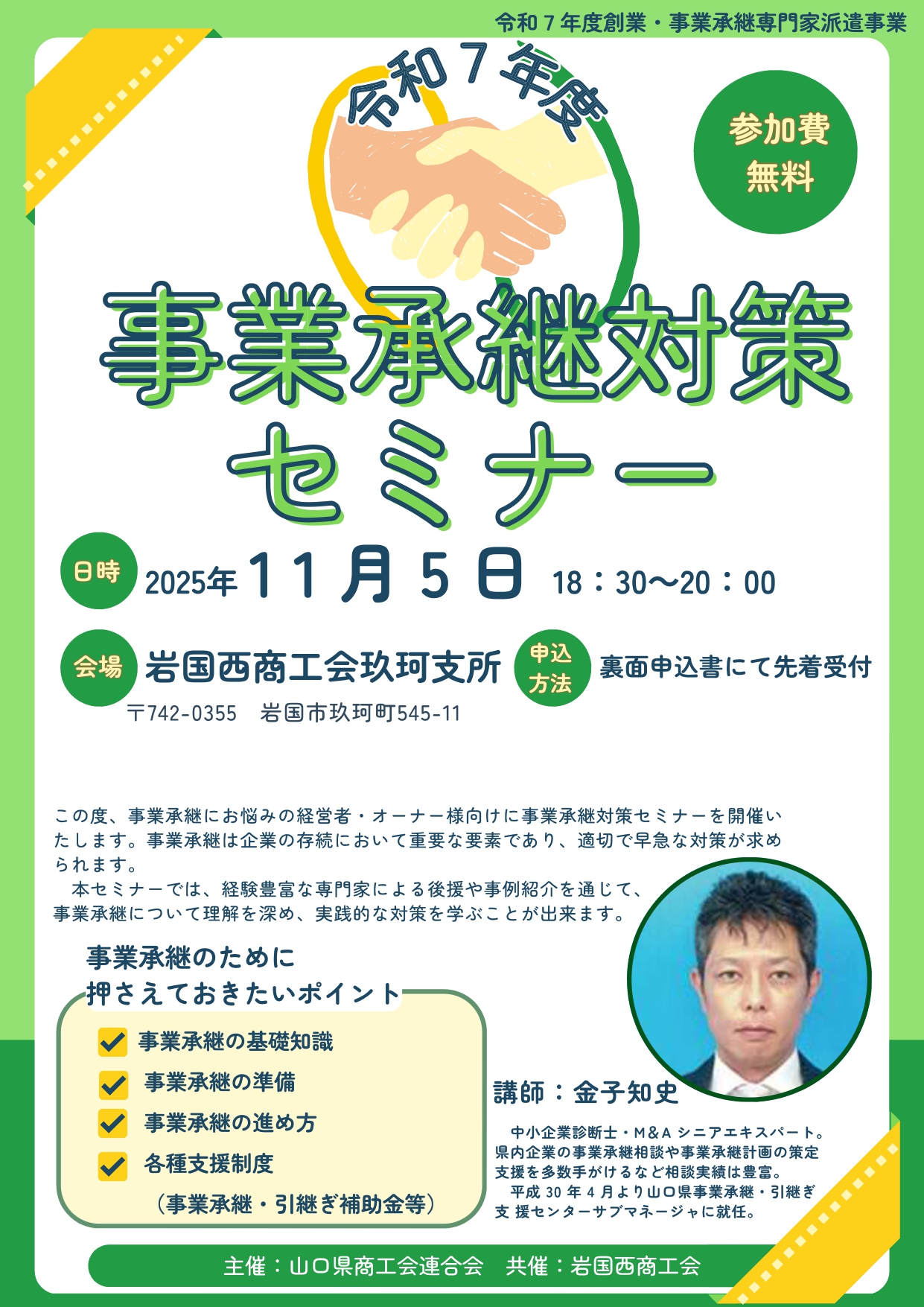 企業の持続的な発展を支援するため、「事業承継対策セミナー」を開催いたします。