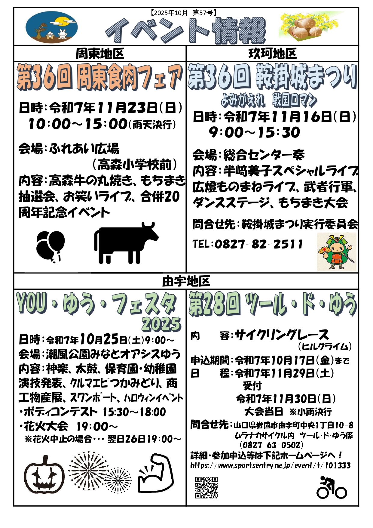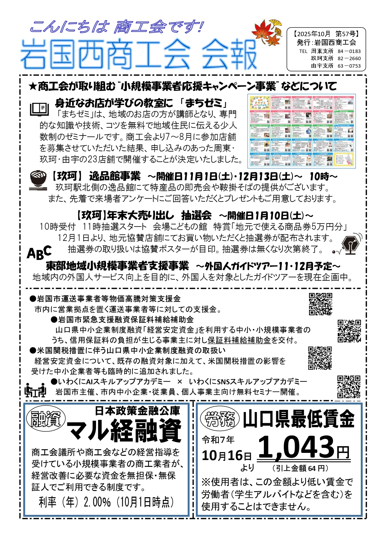2025年10月18日 / 最終更新日 : 2025年10月18日 岩国西商工会 商工会 商工会報第57号を発行しました 本号は商工会が取り組む小規模応援キャンペーン事業や各地域の秋のイベントに関する内容です。 バックナンバーはこちら https://iwakuninishi.com/会報